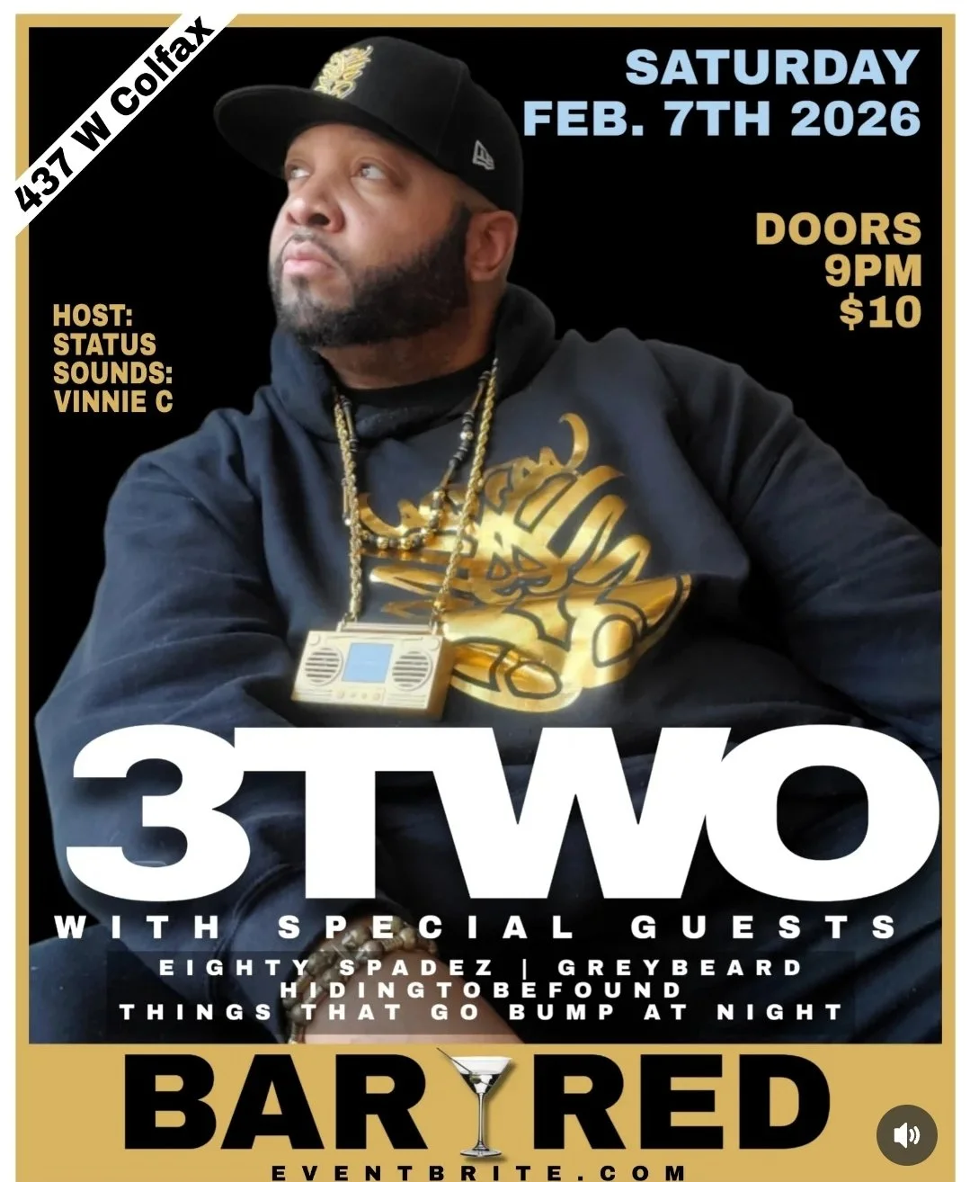 3TWO hops onto the stage with a passion for dynamic performances, paired with a blend of socially conscious boom bap, 808-laced braggadocious flows, and a dash of nerdcore.